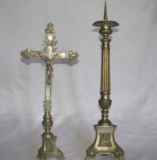2 Garnitures d´autel : 2 Croix d´autel, 4 Chandeliers d´autel : métal : fonte, argenté ; 44 h (croix) ; 45 h (chandelier) h. 4e quart 19e siècle. Fig. 6.