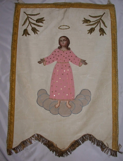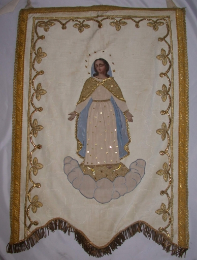 Bannière de procession : Enfant Jésus, Immaculée Conception : soie (blanche) : gros de Tours, moiré, application sur textile ; fil métal : doré, argenté. 1er quart 20e siècle. Fig. 19, 20.