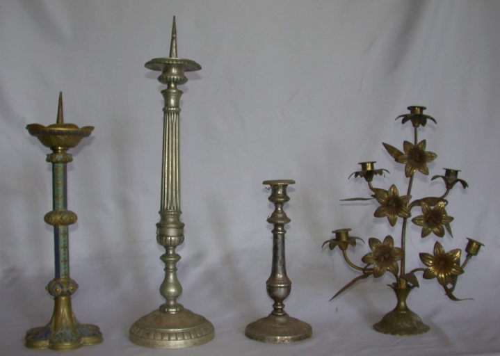 Ensemble de 6 Chandeliers d´autel : métal : fonte, argenté ; 60 h. 4e quart 19e siècle. Pied triangulaire. Représentation : angelots ; coeurs transpercés ; triangle mystique. Fig. 8.
