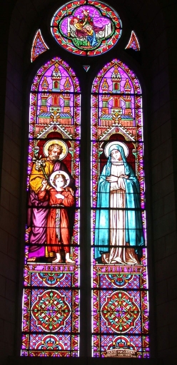 Baie 0 : DONNE PAR / l´abbé vicaire. Baie 1 : DONNE PAR / Jean Regnault : Bouloué ; dans la partie supérieure de la lancette, armoiries du pape Pie IX. Baie 2 : DONNE PAR / JM Berhaut : Ville Roger / François Detoc : La Touche ; dans la partie supérieure de la lancette, armoiries de Mgr Brossay Saint-Marc. Baie 3 : DONNE PAR / Marie Pommier / Vve Bougard : La Victoire. Baie 4 : DONNE PAR / PIERRE et Guillaume BOUGARD : La Victoire. Baie 5 : DONNE PAR / Rosalie ROZE. Baie 6 : DONNE PAR / Vve Jacques / Fresnel et ses enfants. Baie 7 : DONNE PAR / François / Detoc Fils : La Touche Baie 8 : DONNE PAR / Joseph Fouesnel et son épouse. Baie 9 : DONNE PAR / Marie EVEN / Marie-Louise Trelluyef. Sous les personnages : MATER DEI / Stus DOMINICUS. Baie 10 : DONNE PAR / Godefroy / Fresnel Anne Danet : Chatel. Sous les personnages : Sts JOSEPH / Sta MARIA VIRG. Signature et date dans les angles inférieurs : Lobin / Tours / 1872. Baie 11 : DONNE PAR / Joseph Detoc : Bas Bourg. Baie 12 : DONNE PAR / Pierre / Marie Boivin : Ville Roger. Baie 13 : DONNE PAR / Marie / ? Baie 14 : DONNE PAR / Marie- ? Fresnel. Baie 15 : DONNE PAR / Julien Fresnel. Baie 16 : DONNE PAR / Anne Regnault. Baie 18 : DONNE PAR / Joseph Mehault Baie 20 : DONNE PAR / Marie Salmon / Ve Robert : Chêne Berhaut.