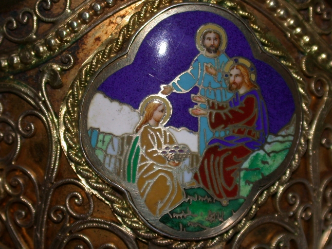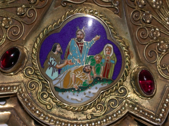La chapelle d'orfèvrerie a été fabriquée par l'orfèvre parisien Antoine Jolivet, actif à partir de 1857. Le bassin est l'oeuvre de l'orfèvre Picard.
