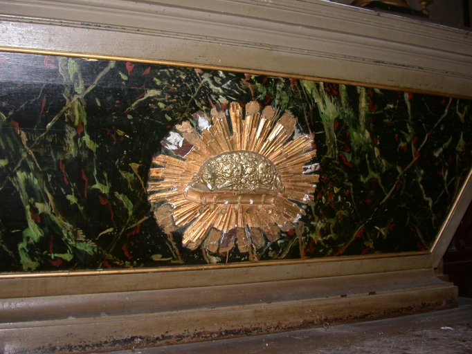 Le retable a été repeint. Il manque quelques éléments du décor de pâte de riz sur les gradins ; éléments en remploi : corbeille de fruits, pots à feux et angelot.