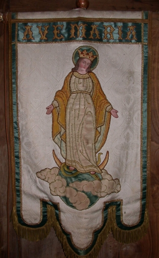 Bannière de procession : Immaculée Conception : soie (blanche) : tissu façonné, brodé, application sur textile ; toile (support) : peinte, polychrome ; fil métal : doré ; 90 h. Le tissu est sale. 1er quart 20e siècle. Représentation : AM. Fig. 40.