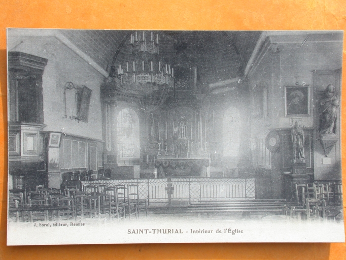 Châsse-reliquaire : métal : fonte, doré ; soie (rouge) : velours uni. Inscriptions manuscrites : st. Judicaël / s. Vinceu & Paul / sti. Turiavi, C.P. / Anna M.V.M. / St. Méen. 17 l. Limite 19e siècle 20e siècle. Représentation : gâble, trilobe. Fig. 13.