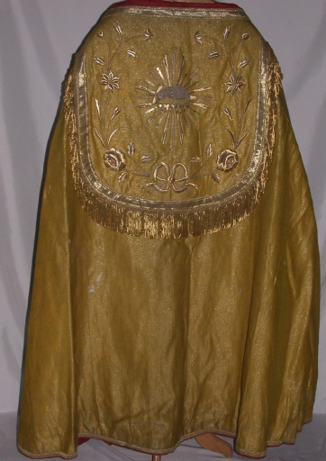 Chape 9 : soie (jaune) : drap d´or, application sur textile, adjonction d´éléments ; fil métal : doré, argenté. Quelques taches. 1er quart 20e siècle. Représentation : Agneau aux sept sceaux, rayons lumineux, ornementation végétale. Fig. 24.