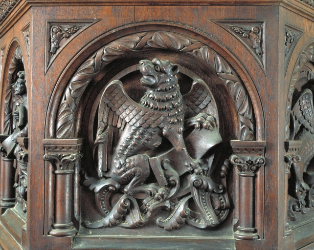 - chêne, mouluré, tourné, décor dans la masse, décor rapporté, décor en bas relief, teint, vernis