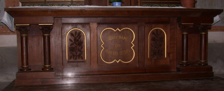 Inscription gravée et peinte en doré sur le panneau central du devant d'autel : NOTRE-DAME / DU / PERPETUEL SECOURS. Le nom des donateurs est peint en doré sur 2 panneaux.