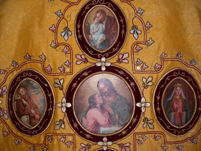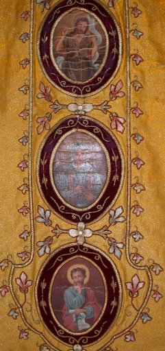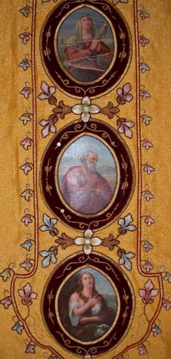 Nombreuses reprises ; le tissu est coupé par l'usure ; les médaillons peints sont abîmés.