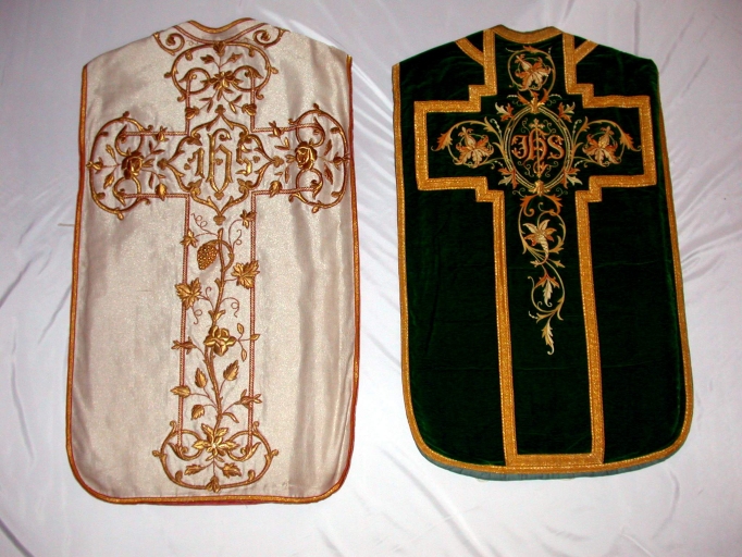 Ornement blanc 2 : chasuble, bourse de corporal, étole, manipule, voile de calice : soie (blanche) : drap d'argent, application sur textile, adjonction d'éléments ; fil métal : argenté, doré ; le tissu et les applications sont usés sur le devant de la chasuble. Limite 19e siècle 20e siècle. Représentation : IHS ; vigne ; ornementation végétale. Fig. 22.