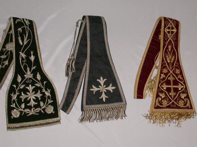 Etole pastorale 1 : soie (noire) : velours uni, application sur textile, adjonction d'éléments ; fil métal : argenté. 4e quart 19e siècle. Représentation : croix ; ornementation végétale. Fig. 26.