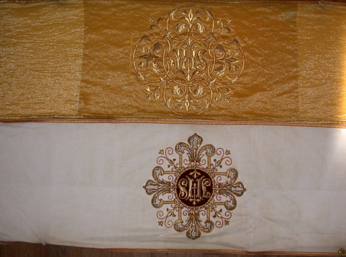 Voile huméral 2 : soie (blanche) : gros de Tours, moiré, application sur textile ; fil métal : argenté, doré. 1er quart 20e siècle. Représentation : IHS cercle ; fleurons. Fig. 29.