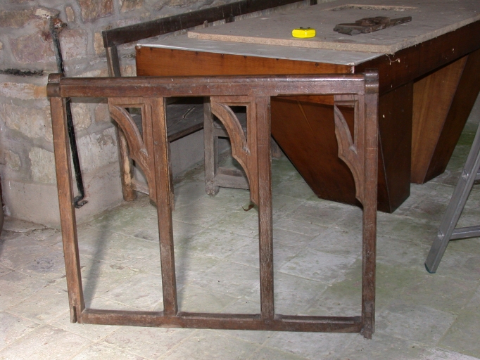 Le premier banc possédait un pupitre qui est en partie déposé.