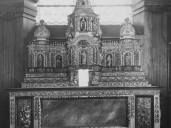 Les colonnes de marbre, les vases de fruits, les volutes et guirlandes de fleurs sont des réemplois d'un baldaquin antérieur, probablement de la seconde moitié du 17e siècle et contemporains des lambris du choeur.