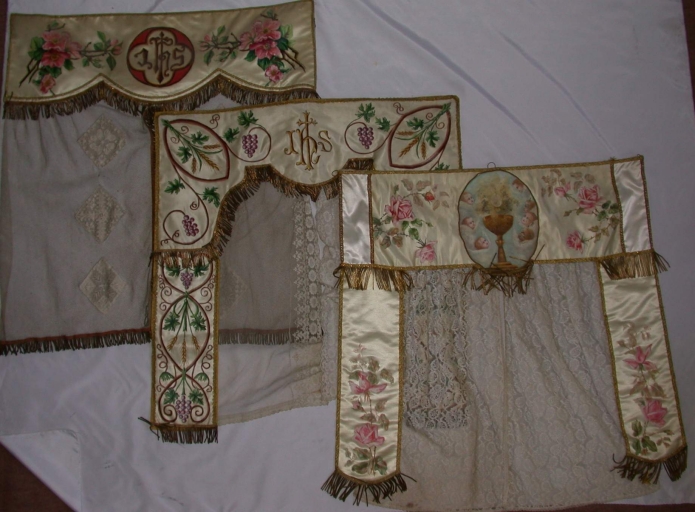 Conopée 1 : soie (blanche) : satin, peint, polychrome, application sur textile, dentelle ; fil métal : doré. 1er quart 20e siècle. Représentation : IHS, croix, quadrilobe, fleurs d´églantine. Fig. 16 .
