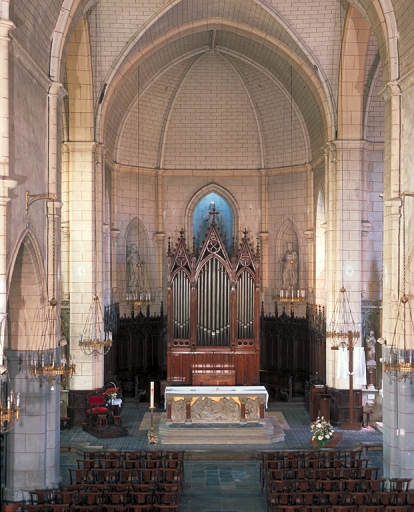 Ornement blanc : Chasuble, Bourse de corporal, Etole, Voile de calice : soie (blanche) : gros de Tours, application sur textile. Manque le manipule. 1er quart 20e siècle. Représentation : AM ; fleur de lys. Fig. 12.