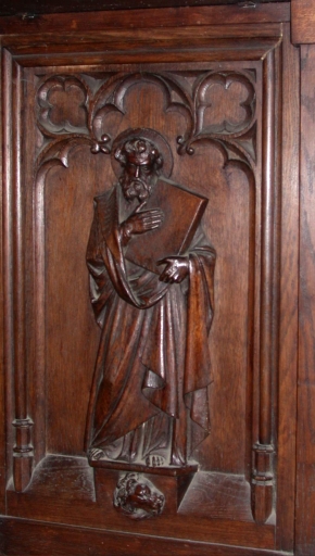 - chêne, mouluré, découpé, décor dans la masse, décor rapporté, décor en demi relief, teint, vernis