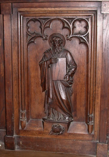La chaire a peut-être été réalisée par le sculpteur vitréen Victor Augerie en 1874, sur un dessin de Granneau.