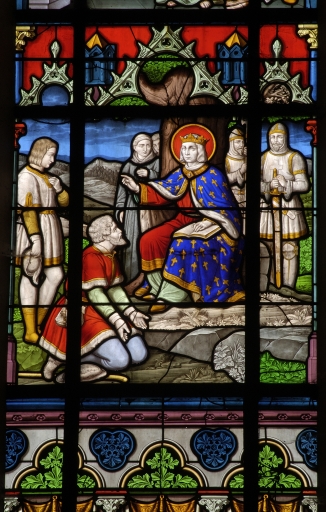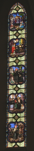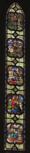 Ensemble des 5 verrières du choeur (baies 100 à 104) : Scènes de la vie de saint Martin de Vertou, Saint Louis rend la justice, Martyre de sainte Félicité, Assomption,