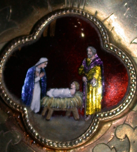 Ensemble réalisé par l'orfèvre lyonnais Henri Nesme pour l'abbé Louis Lucas et consacré en 1889, selon un certificat conservé dans la boîte.