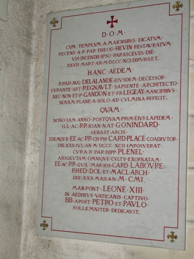 Signature gravée et peinte en bas à gauche : HARY NORBERT VITRE. Inscription gravée et peinte : LE VENDREDI SAINT, 27 MARS 1891, / UN INCENDIE DETRUISIT L'EGLISE D'ETRELLES / NOUVELLEMENT RESTAUREE / PAR M. LE RECTEUR THEODORE HEVIN. / SON SUCCESSEUR, M. AUGUSTE DELALANDE, / EDIFIA CE SANCTUAIRE / SUR LES PLANS DE M. L'ARCHITECTE ARTHUR REGNAULT, / AVEC LE CONCOURS / DE M.M. PIERRE GANDON ET FRANCOIS LEGEAY, ENTREPRENEURS. / LE 22 JUILLET 1892 / S.G.MGR JEAN NATALIS GONINDARD, ARCHEV. DE SEBASTE, ET COADJUTEUR / DE / S.E. LE CARDINAL PLACE, / EN POSA LA PREMIERE PIERRE. / LE 30 MAI 1901 / SOUS LE RECTORAT DE M. HIPPOLYTE PLENEL, / L'EGLISE ACHEVEE ET DECOREE PAR SES SOINS / RECUT, / LA PREMIERE DU DIOCESE EN CE SIECLE XXEME, / LES HONNEURS DE LA CONSECRATION / DES MAINS DE / S.E. MGR GUIL. MARIE JOSEPH CARDINAL LABOURE / ARCHEVEQUE DE RENNES, DOL ET ST MALO, / ET FUT PAR LUI MEME DEDIEE / AUX SAINTS APOTRES PIERRE ET PAUL.