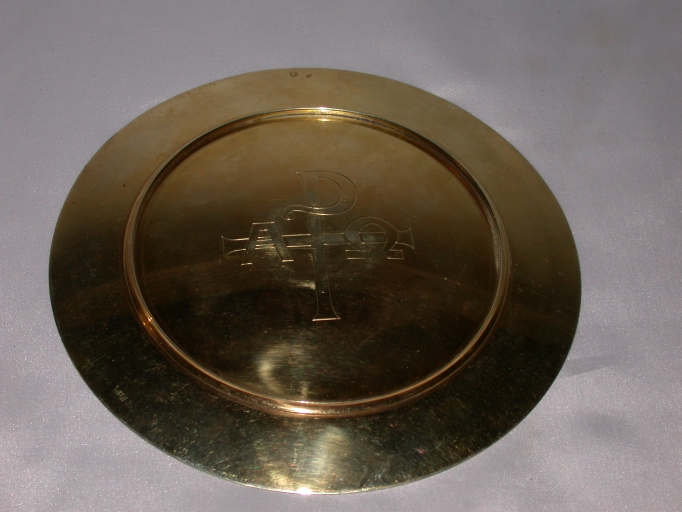 Ensemble fabriqué à Lyon par l'atelier d'Henri Nesme, consacré en 1957 pour le prêtre Melaine Restif (acte conservé dans la boîte).