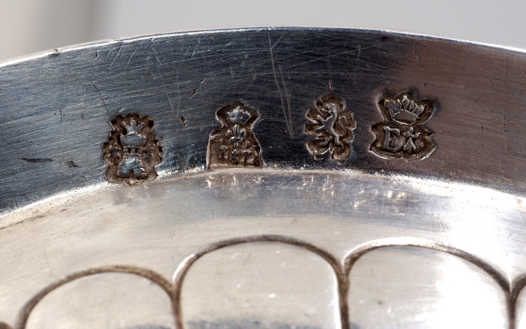 Les poinçons sous l'aile : poinçon de charge pour Vitré : une tour couronnée encadrée de 2 hermines ; poinçon de décharge pour Vitré : lion dressé vers la gauche ; poinçon de maître : lettres I L séparées par une hermine, une fleur de lys couronnée au-dessus, encadrée par deux grains. Lettre-date pour Vitré : lettre E, une hermine à droite, le tout couronné (couronne à 8 branches) : 1735-1738. Initiales gravées : I V séparées et encadrées de fleurettes.