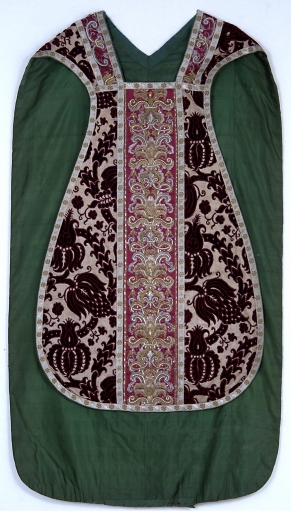 Cet ornement peut être daté du 17e siècle. Le médaillon placé au centre de la chasuble, en broderie de fils d'or couchés (avec visages au passé empiétant), peut être daté du 3e quart du 17e siècle. La broderie, ou peinture à l'aiguille, appliquée sur le voile de calice, est très certainement un travail réalisé par des Ursulines.