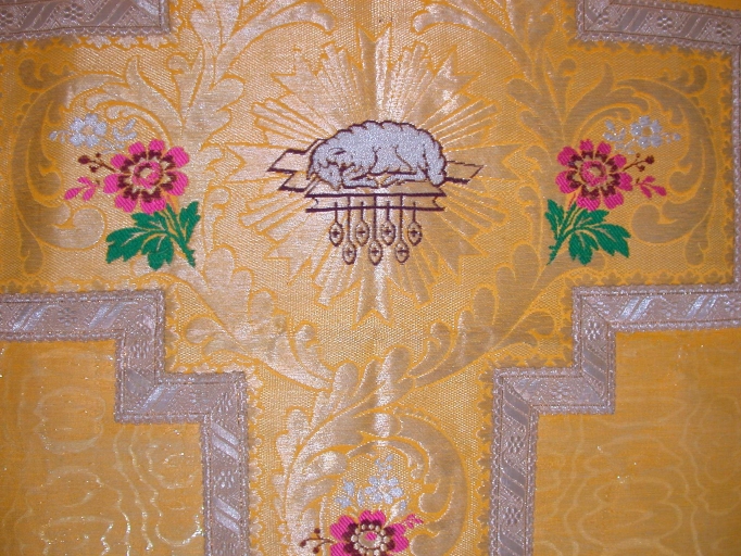 Il manque la bourse de corporal et le manipule. Le tissu est usé sur le devant de la chasuble.