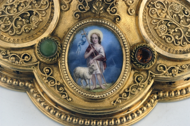 Les 2 poinçons sont sur la patène ; poinçon de fabricant mal lisible. Le poinçon officiel est sur le pied et la coupe. Inscription sur la coupe : HIC EST ENIM CALIX SANGUINIS MEI. Inscription gravée sur une plaque, sous le pied : A L'ABBE / VILLENEUVE / SON AUMONIER / LE 3me Bon / DE LA GARDE MOBILE / D'ILE [sic] ET VILAINE / (VITRE REDON) / COMMt CH. PLAINE-LEPINE / TRESr L. GAUTREAU / SIEGE DE PARIS / 1870-1871.