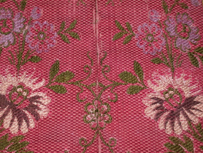 - soie, rouge tissu façonné, broché, polychrome, application sur textile