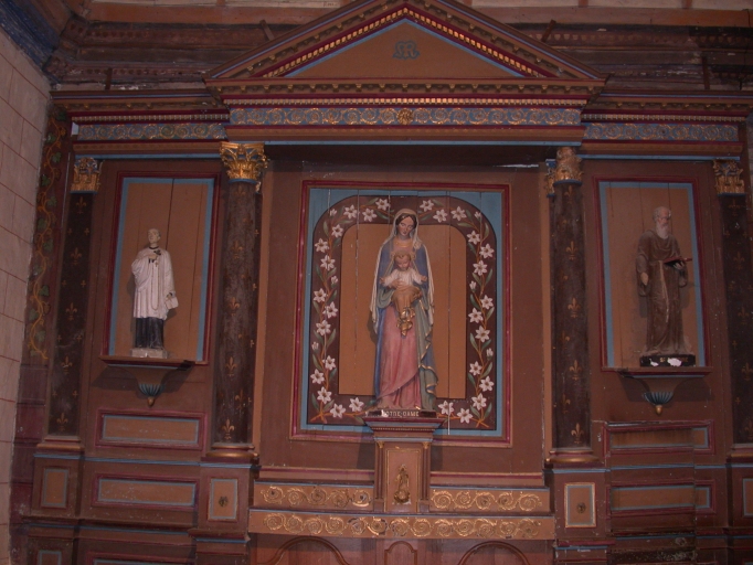 Panneaux du retable dissociés et affaissés vers la droite. Nombreux éléments du décor manquants ; le chapiteau de la colonne droite est particulièrement abîmé. Autel uni à celui du sud, pour former un autel face aux fidèles.