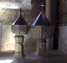 Ancienne mesure à grains, aujourd'hui bénitier sur pied,