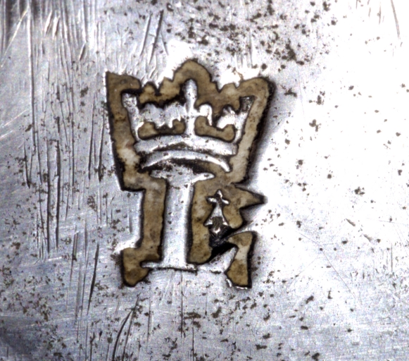 Les poinçons sont à l'arrière à mi-hauteur. Poinçon de charge de Rennes de 1704 à 1719 : un 9 surmonté d'une fleur de lys, une hermine, dans l'oeil du 9. Lettre-date de Rennes de 1714-1715 : lettre L couronnée, accompagnée d'une hermine. Poinçon de maître : lettres I C séparées par une hermine, surmontées d'une fleur de lys couronnée et encadrée de deux points.