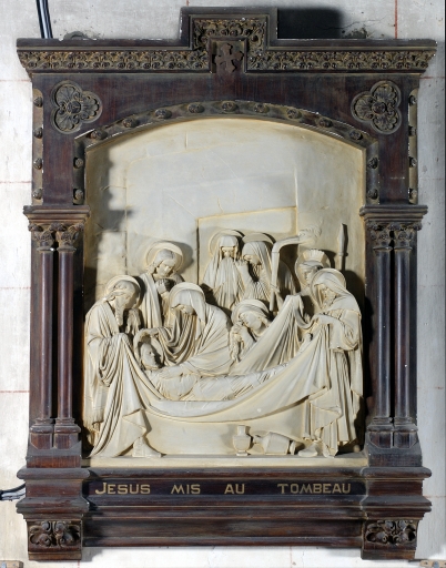 Marque en creux sur le côté du cadre : ROUILLARD STATUAIRE / ANGERS. Le titre de la station est peint en doré sous chaque scène.