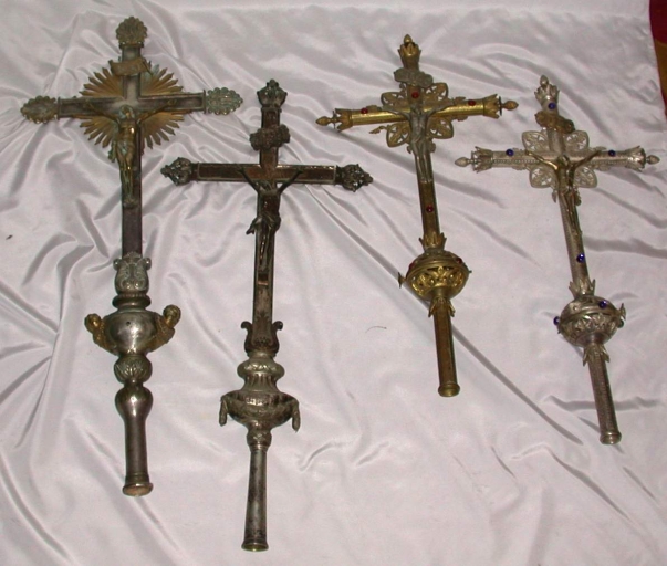 Paire de Croix de procession : métal : fondu, argenté, doré, ajouré ; verre transparent (bleu, rouge) : taillé en cabochon ; 71, 5 h. Oeuvre déposée. Limite 19e siècle 20e siècle. Représentation : ornementation végétale. Fig. 20.