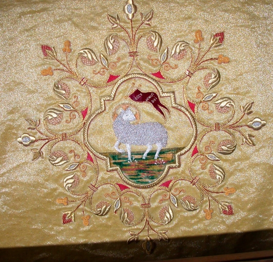 Voile huméral 1 : soie (jaune) : drap d´or, application sur textile ; fil métal : doré, argenté. Oeuvre déposée. 1er quart 20e siècle. Représentation : agneau pascal ; ornementation végétale. Fig. 36, 37, 38.