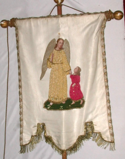 Bannière de procession : Immaculée conception, Ange gardien : soie : satin, application sur textile, adjonction d´élément ; textile (support) : peint, polychrome ; fil métal : doré, argenté. Oeuvre restaurée. Les satins de fond ont probablement été remplacés. Limite 19e siècle 20e siècle. Fig. 18, 19.