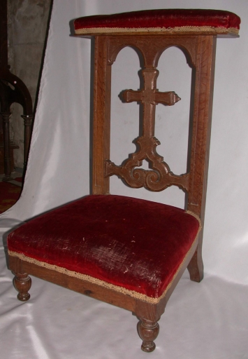 Prie-Dieu : bois : mouluré, découpé, décor poinçonné ; soie (rouge) : velours uni, application sur textile ; 87 h. Limite 19e siècle 20e siècle. Fig. 7.