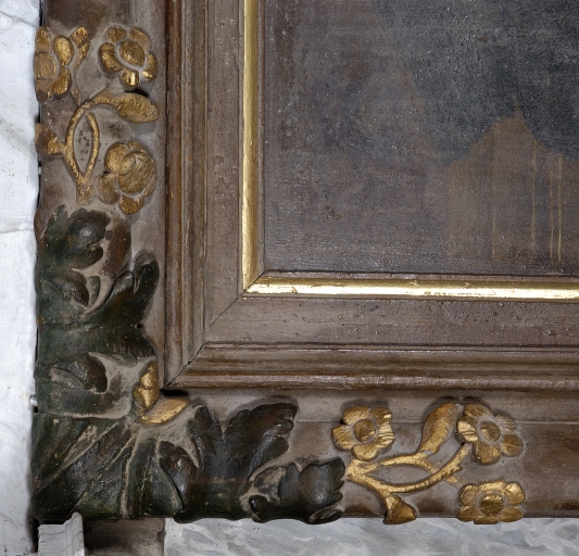 Tableau d'autel dans son cadre : Vierge à l'Enfant avec un donateur présenté par saint Pierre,