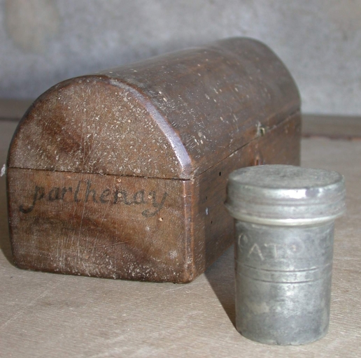 Inscription gravée sur l'ampoule : O CAT. Inscription manuscrite à l'encre sur le coffret : PARTHENAY.