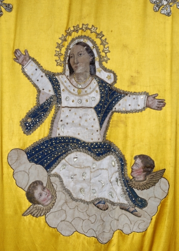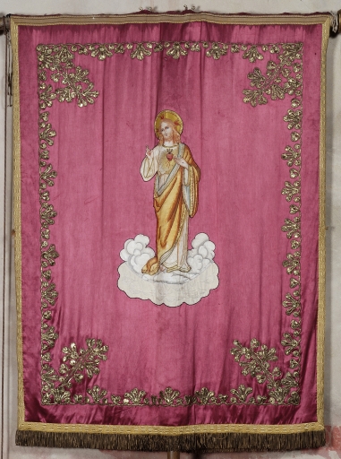 La bannière fabriquée au milieu du 19e siècle portait la représentation de l'Assomption et une autre représentation qui a été remplacée, au début du 20e siècle par la figuration du Sacré Coeur, tandis que l'on remplaçait le tissu des fonds, probablement du velours, par du satin.