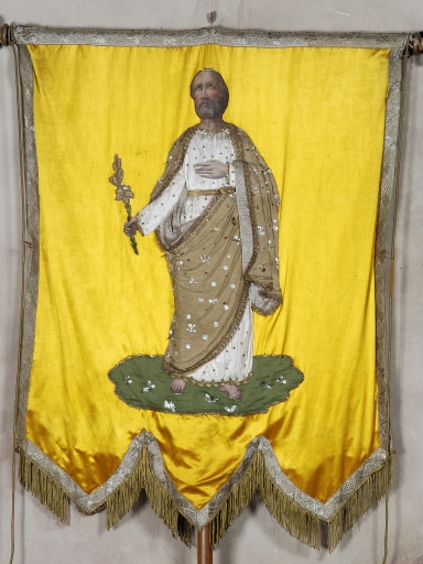 - PIOBJT Malgré une restauration agressive (remontage sur un tissu peu adapté), la bannière est porte un thème iconographique intéressant (coeurs).