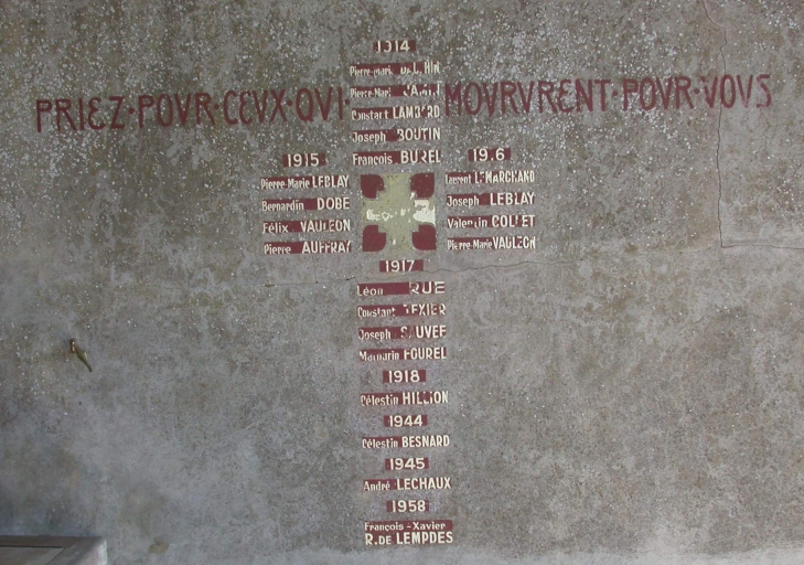 Inscription peinte : PRIEZ POUR CEUX QUI SONT MORTS POUR NOUS. Les prénoms et noms des morts sont disposés, sous l'année de leur décès, de façon à constituer une croix.