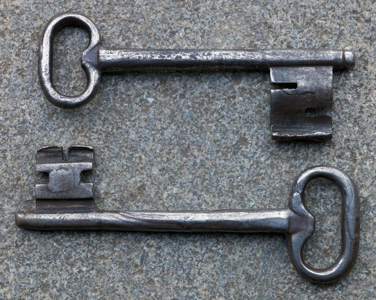 Il s'agit de la clé de la porte de la sacristie, elle est en fer forgé. L'anneau est écrasé, la tige est ronde à boule et le panneton à deux rouets. Le profil est en point d'interrogation.