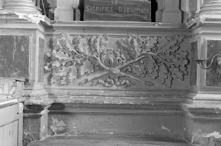 Inscription et armoiries dans le cartouche sommant le tableau central : sous une couronne dont l'intérieur est peint en rouge, clés en sautoir, armes du chapitre de la cathédrale de Rennes. Dans le fronton curviligne du sommet : armes de Bois-le-Houx-Vendel.