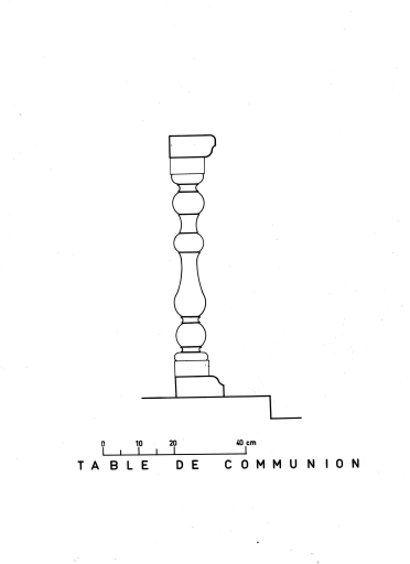La table a été décapée lors de la restauration de l'église et remise couleur bois (chêne clair). Les balustres ont été démontés et l'un remis à l'envers.