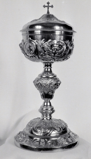 Ciboire réalisé par l'orfèvre parisien Jean-Philippe-Adolphe Dejean entre 1846 et 1865, date d'utilisation de son poinçon. Le style permet une datation plus proche de 1846.