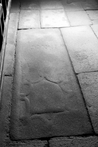 Dalle n° 1 : LE COPRS DE JEAN PINEL DECEDE EN AOUST 1589. Dalle n°2 : CY GIST/ LE CORPS DE RER [...] ILLA / VNE RR DE CETTE PAR / [...]LE[...]MS (calice, corporal) 1740. Dalle n° 3 : CI GIST LE / CORPS DE / HONORA / (blé) FEM IEN / ME / L ASTO / N DECEDE / LE 24 IOV / R DE FEVR/IER 1651. Dalle n°4 : [CI GIST LE] / CORPS D[E]ALAIN ERMEMIE[...]EDALAN[...]1598. Dalle n°5 : CY/ GIST / LE COPRS / DE IEAN PRODHO / ME BAST / AIDLAYD/ECEDE LE / 26 AVRIL 1666. Dalle n°6 : CY GIST LE / CORPS DE / H (honorable) HOMME / IAN LE / MOINE / DECEDE / LE 31 MAY / 1710 / PRIES DIEU / POUR : SON / AME. Dalle n°7 : CI GIST LE / CORPS DE NOBLE HOMME IHAN PI/NEL DECE / DE. 19 ME DE AOUST 1. 5. 9. 9. Dalle n° 8 : MISSIRE RE/NE PINEL C [...] / NER [...]EUR / IAN [...] / PA [...] NAEL/CAN[...] INE/GL[...]AN[...] AL S SIGN / EVR DE CHAU / DEBEV F FONDATEUR DE S (aint) SAV (eur). Dalle n°9 : date porte MCCC le nom de Chaudeboeuf donné par Banéat est effacé ; Dalle n° 10 : CI GIST MESSRF/RACOS/PINELCH DE LORDRE DU ROY VIVANT / SEIGNEUR CHAV / DEBEUF FODATER DE CESTE EGLISE DECEDE LE / 1ER IOR DE 1574. Dalle n°11 : CI GIST/LE CORPS DE NOBLE DAMEJACQUEMINE / DU PARC DAME / DE CHAUDBEUF DECEDE LE 18 JUIEL / ET 1648. Dalle n° 12 : LE PAGE [...] CHA (pelain) : / DV HAULT MOUC [...] 6ME/DBRE /1659[...]. Dalle n° 13 : CHAUDEBEUF. Femme représentée.