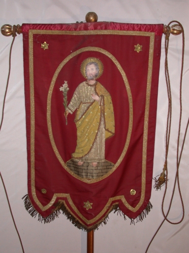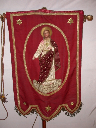 Bannière de procession : Sacré coeur, saint Joseph : soie (rouge) : satin, application sur textile, adjonction d´éléments ; fil métal : doré, argenté. Le tissu du fond est un peu usé. Limite 19e siècle. Fig. 16, 17.