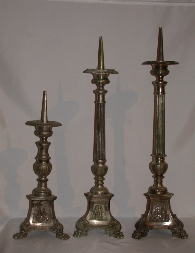 Série 1 de 6 Chandeliers d´autel : métal : fondu, argenté ; 66h. Deux chandeliers ont été raccourcis. Représentation : Christ, Vierge, coeurs enflammés. Fig. 8.